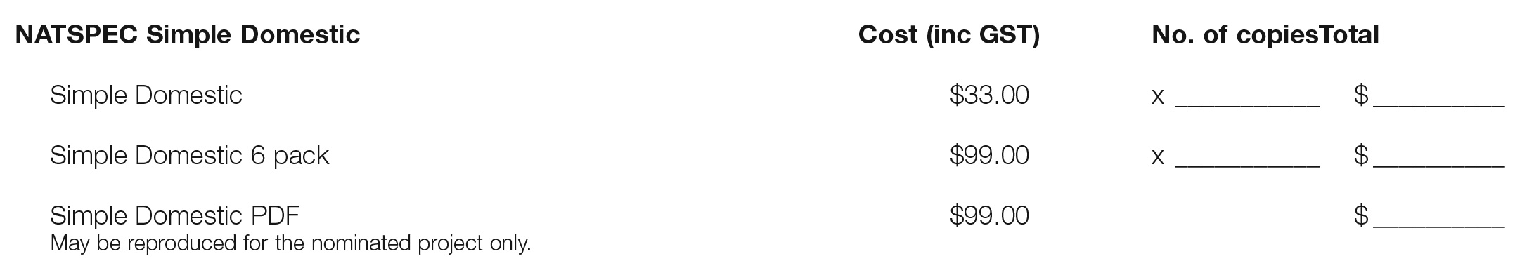 Natspec Simple Domestic is available from Natspec in either hard copy or pdf. Though a bit hard to find, the order form is on their subscribe page at: http://www.natspec.com.au/products/subscribe